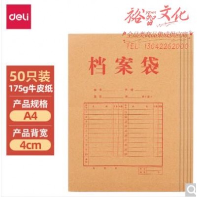 得力(deli)A4/50只175g牛皮纸档案袋 侧宽4cm标书合同文件资料袋财务票据收纳 27044 SKU:yzwhyp824322