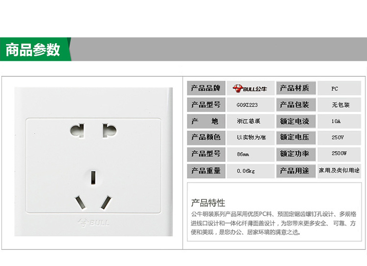 公牛(BULL) 明装开关插座 G09系列 五孔开关 86型插座面板 G09Z223SKU:yzwhyp828958