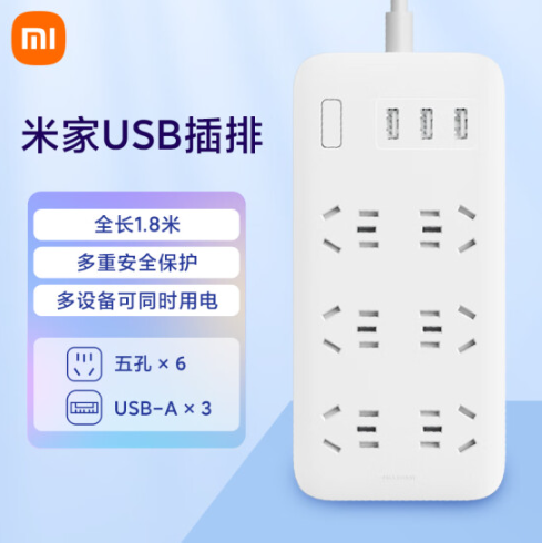 小米(MI)米家6孔位插线板/USB插座/插排/排插/拖线板/插板/接线板 3USB接口 全长1.8米SKU:yzwhyp832731