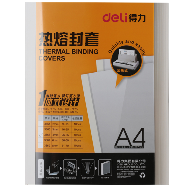 得力(deli)3866 热熔封套 热熔装订机专用装订封皮 A4/4mm(10个装) SKU:yzwhyp833783
