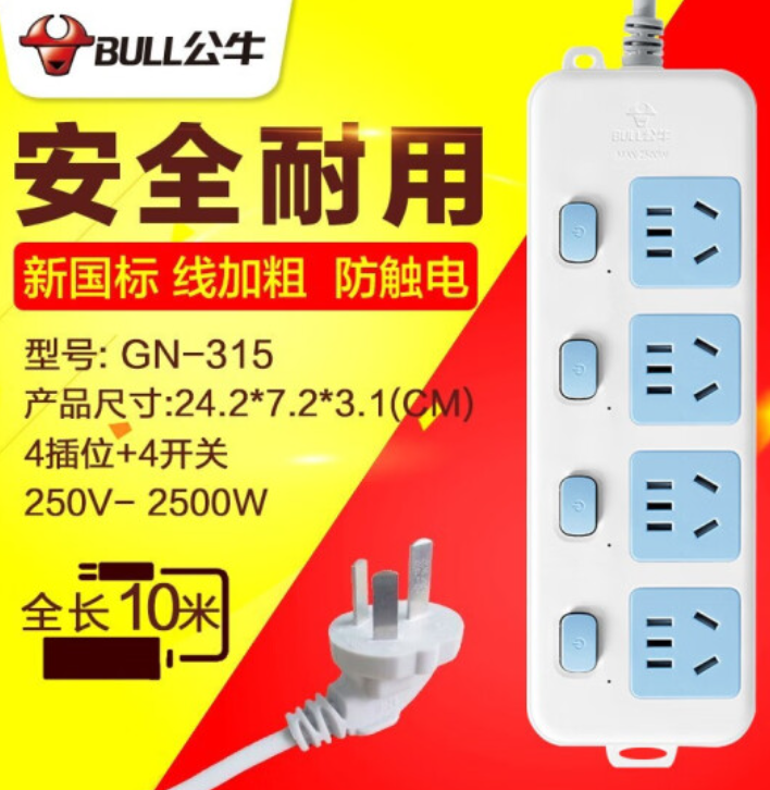 首页 > 建筑建材 > 开关插座 > 公牛插座独立开关插排面板多孔多功能一位一控多开关分控排插 【四插位4开关】全长10米 SKU:yzwhyp834932