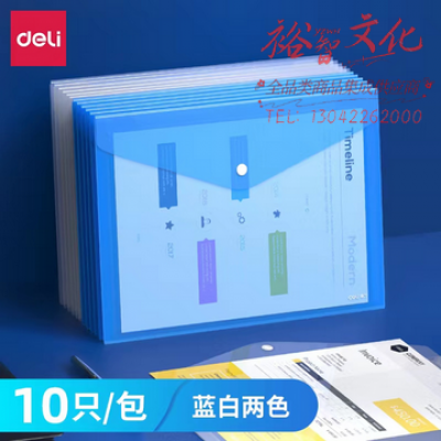 得力(deli)10只 A4透明文件袋 按扣资料袋 塑料档案袋 学生试卷收纳袋 8308 白色、蓝色(下单备注颜色)SKU:YZB101390