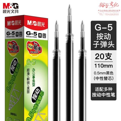晨光(MG)文具G-5黑色0.5mm按动子弹头中性笔芯 签字笔替芯 水笔芯 1008/K35/S01/S08适用 20支/盒SKU:yzwhyp842389