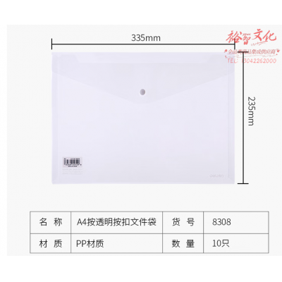 得力 8308 A4 透明按扣文件袋 (只)(10只/包,整包销售) SKU:YZB101746