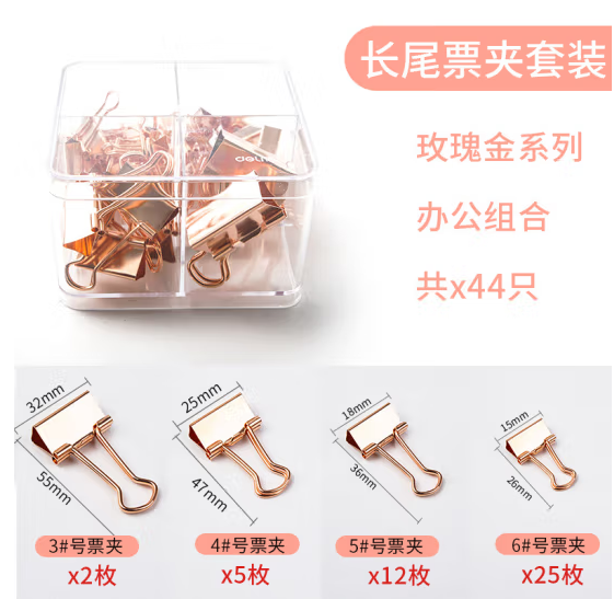 得力78205长尾票夹套装(玫瑰金)(44只/盒)SKU:yzwhyp845700