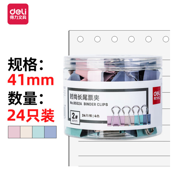 得力8552A时尚长尾票夹(混色)(24只/桶)SKU:yzwhyp845996