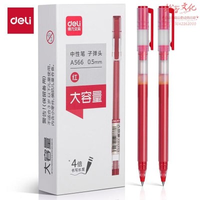 得力(deli)文具0.5mm子弹头4倍书写大容量中性笔 笔芯笔杆一体化签字笔水笔 刷题必备学生 红色 12支/盒A566SKU:yzwhyp846450