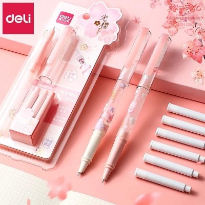 得力钢笔学生考试用可擦替换墨囊樱花文具大赏限定矫姿练字笔三年级儿童墨水笔送人节日礼物 A938可擦纯蓝-樱花粉SKU:yzwhyp846499