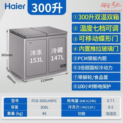 海尔(Haier)冰柜双温商用家用大容量300升双箱蝶形双开门带玻璃门冷冻冷藏两用冰柜FCD-300LHSPCSKU:yzwhyp847698