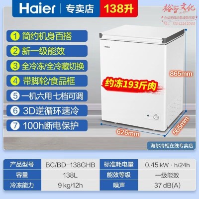 海尔(Haier)冰柜家用138升单温卧式小冷柜冷藏冷冻一级能效冷柜冷冻冰柜商用大容量冰箱 138升约冻190斤肉SKU:yzwhyp847740