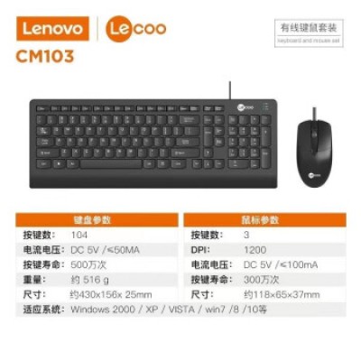 联想来酷CM103有线键鼠套装 商务办公打字专用笔记本外接USB接口电脑有线键盘鼠标 黑色有线键鼠套装 50个起购SKU:YZB101881