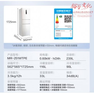 美的(Midea)三门家用小冰箱小型三开门风冷无霜变频一级能效节能省电轻音净味保鲜宿舍租房电冰箱MR-251WTPESKU:yzwhyp850476