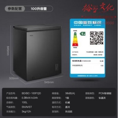 TCL 100升低霜节能冷柜小型冰柜38分贝7档宽幅变温顶开卧式家用冷藏冷冻转换冷柜BD/BC-100FQDSKU:yzwhyp852725