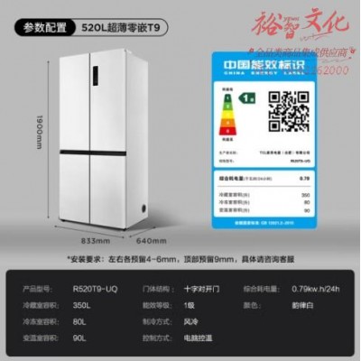 TCL 超薄零嵌系列520L十字四开门超薄嵌入式大容量家用白色电冰箱一级变频底部散热双循环R520T9-UQSKU:yzwhyp852851