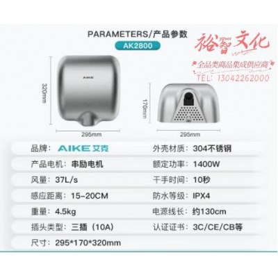 艾克(AIKE) 不锈钢高速烘手器公共卫生间干手器全自动感应烘手机吹手干手机 【AK2800拉丝】1400W/智能冷热风SKU:yzwhyp855213