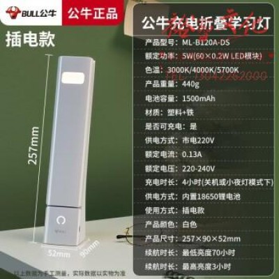 公牛(BULL) 照明led台灯充电便携式可充电台灯夹子台灯宿舍床头读写护眼台灯 叠台灯无极调光1500mAh,5WSKU:yzwhyp857498