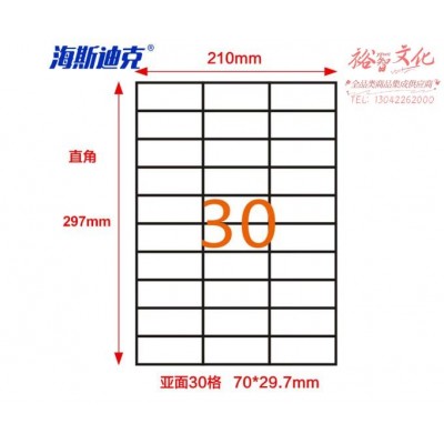 海斯迪克 HKLY-97 亚光a4不干胶 库房货位打印纸 标签纸 30格70*29.7mm 80张直角SKU:yzwhyp863524