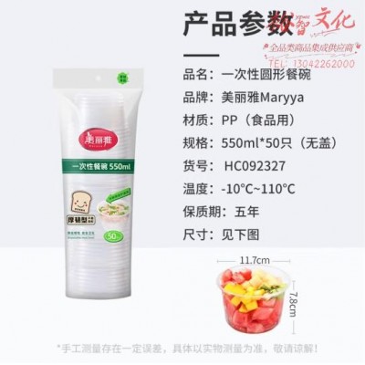 美丽雅一次性碗食品级550ml*50只 耐高温微波打包野餐盒透明汤碗不带盖SKU:yzwhyp864882