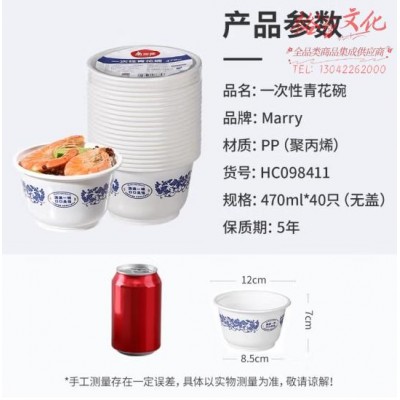 美丽雅 一次性碗食品级 耐高温饭盒青花加厚圆形塑料餐盒470ml*40只SKU:yzwhyp864898