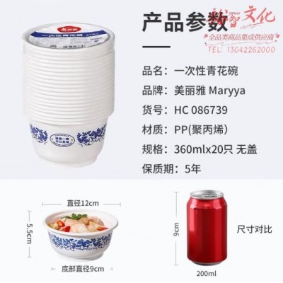 美丽雅 一次性小碗360ml*20只 青花塑料餐盒食品级汤圆米饭冰粉碗不带盖SKU:yzwhyp864899