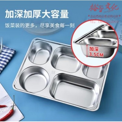 屋田304不锈钢快餐盘可订制刻字长方形成人学生食堂餐盘5格加厚带盖SKU:yzwhyp864945