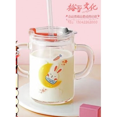 富光 玻璃杯家用儿童牛奶杯子带刻度耐热吸管水杯喝奶杯微波炉可加热粉SKU:yzwhyp865453