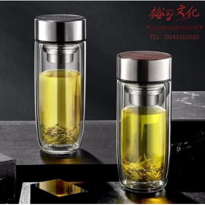 富光玻璃杯双层 带茶隔水杯大容量直身杯子茶水分离便携车载泡茶杯男 皮纹黑杯盖SKU:yzwhyp865460