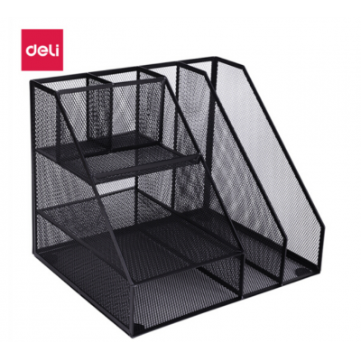 得力79075多功能文件框(黑)(单位:只)金属网材组合式文件框书立 办公室桌面多层资料架子分层收纳文件架带笔筒