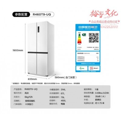 首页 > 电气设备 > 电冰箱 > TCL 460升T9十字门超薄平嵌冰箱白色 58cm超薄机身一级能效变频 底部散热 宽幅变温 杀菌除味双循环 R460T9-UQ韵律白SKU:yzwhyp869129