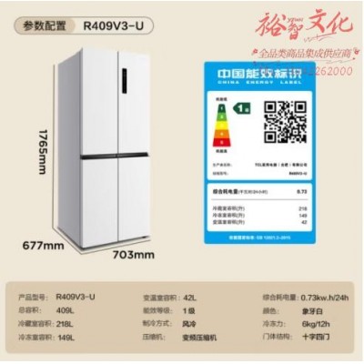 TCL 409升十字对开四开门白色冰箱 一级能效 变频离子杀菌除味 风冷无霜33分贝家用电冰箱 R409V3-USKU:yzwhyp869142