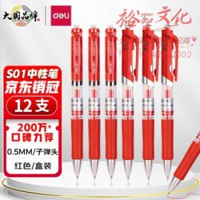 得力(deli)S01中性笔签字笔 0.5mm子弹头经典办公按动笔水笔 红色 12支盒SKU:yzwhyp876236