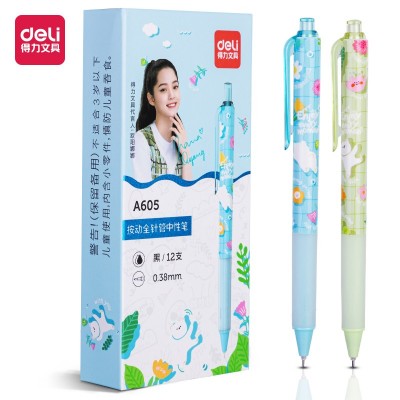 得力A605 学生中性笔0.38mm按动全针管(黑)(12支/盒)