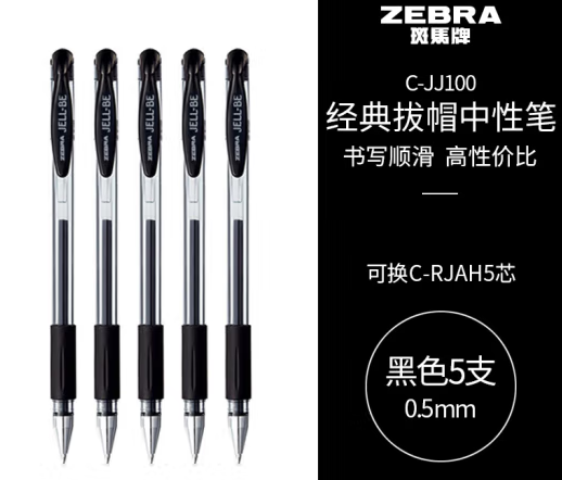 首页 > 办公用品 > 文具 > 斑马牌(ZEBRA)中性笔 0.5mm子弹头签字笔 学生标记笔走珠水性笔 C-JJ100 JELL-BE 黑色 5支装 (zhyghf_23099068)SKU:yzwhyp882404