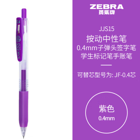 首页 > 办公用品 > 文具 > 斑马牌(ZEBRA)0.4mm子弹头按动中性笔 彩色学生笔记签字笔学习标注填色手账笔 JJS15 紫色 单支装 (zhyghf_23099028)SKU:yzwhyp882739