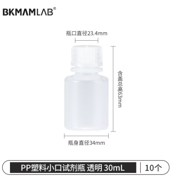 首页 > 仪器仪表 > 生物、医学样品制备设备 > 比克曼生物(BKMAM)PP塑料试剂瓶大广口瓶耐高温酸碱化学实验室样品瓶 【小口透明】30mL-10个/包 1包 (zhyghf_221721280)SKU:yzwhyp882777