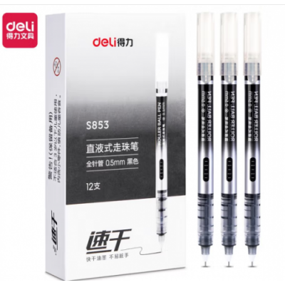 得力(deli)直液笔签字笔 0.5mm全针管彩色学生中性笔绘画彩绘笔 水笔走珠笔S853(黑)(12支/盒)