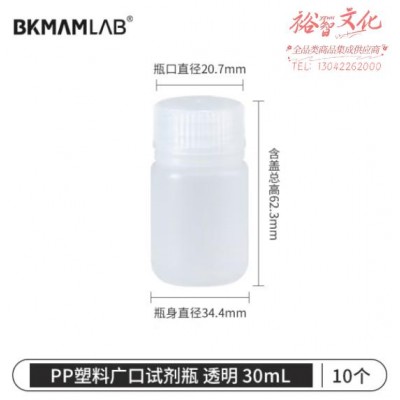 首页 > 仪器仪表 > 生物、医学样品制备设备 > 比克曼生物(BKMAM)PP塑料试剂瓶大广口瓶耐高温酸碱化学实验室样品瓶 【广口透明】30mL-10个/包 1包 (zhyghf_221721270)SKU:yzwhyp882963