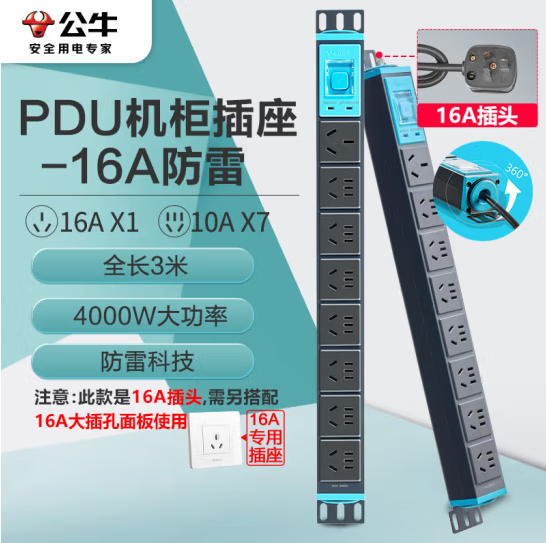 公牛(BULL)GNE-108DT 8位总控全长3米 16A大功率防雷PDU机柜插座 (zhyghf_221711892)SKU:yzwhyp884921