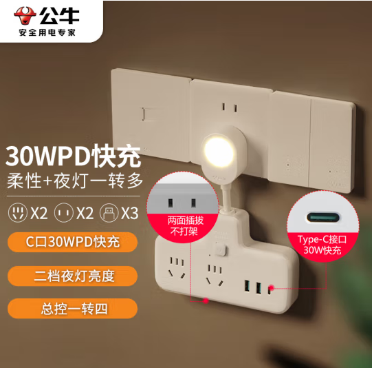 首页 > 建筑建材 > 开关插座 > 公牛(BULL)30W PD苹果快充柔性转换插头/一转四插座/无线转换插座/电源转换器 4位 USB 夜灯GN-97221Q30Y (zhyghf_221711956)SKU:yzwhyp884942