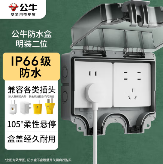 公牛(BULL)开关插座 86型防水开关面板盒防水罩插座浴室防水盒 F08 明装两位 (zhyghf_221712076)SKU:yzwhyp885008