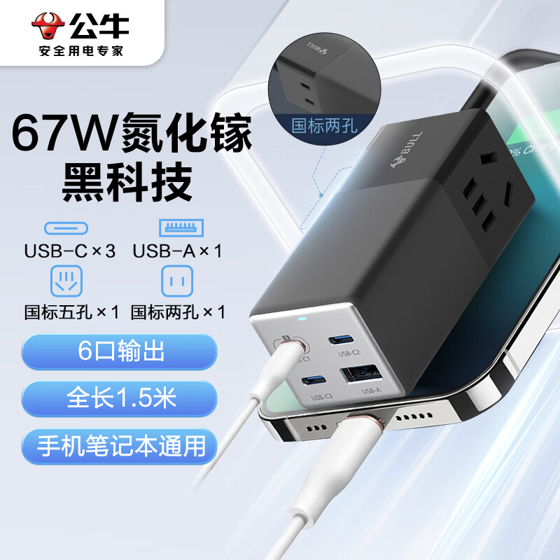 首页 > 建筑建材 > 开关插座 > 公牛(BULL)氮化镓67W快充笔记本多功能插座/插线板/插排/接线板 USB(3C1A) 2插孔 全长1.5米 GNV-MC1672 (zhyghf_221711901)SKU:yzwhyp885071