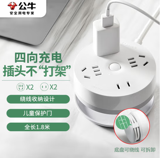 公牛(BULL)可收纳绕线圆形插座4位总控 全长1.8米 GN-R2220S (zhyghf_221712179)SKU:yzwhyp885100