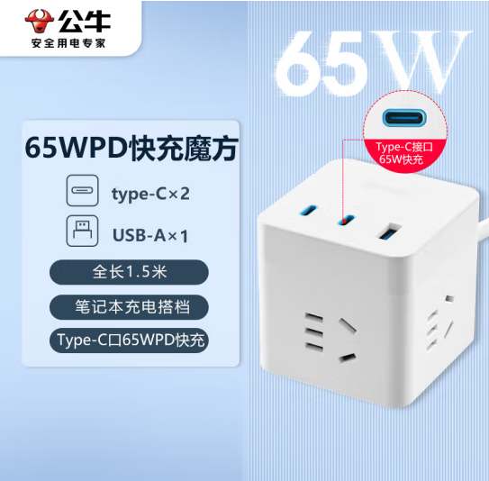 首页 > 建筑建材 > 开关插座 > 公牛(BULL)65W PD苹果快充魔方插座/插线板/插排/接线板 Type-c USB 3插孔 全长1.5米白色GNV-UU3653 (zhyghf_221711911)SKU:yzwhyp885146