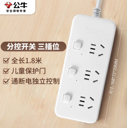 首页 > 建筑建材 > 开关插座 > 公牛(BULL)新国标分控插座/插线板/插排/排插/接线板/拖线板 GN-B2033 3位分控全长1.8米 独立开关 (zhyghf_221712168)SKU:yzwhyp885153