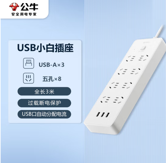 首页 > 建筑建材 > 开关插座 > 公牛(BULL)超功率保护 新国标公牛小白USB插座/插线板/插排/排插 GNV-UUN158 3usb接口 8孔全长3米 (zhyghf_221711949)SKU:yzwhyp885165