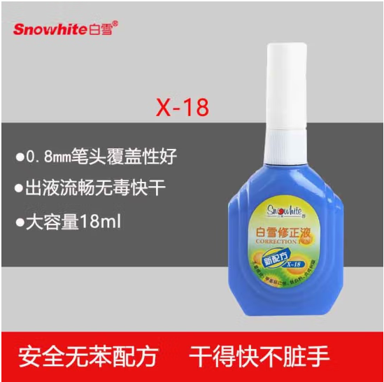 首页 > 办公用品 > 文具 > 白雪(snowhite)修正液X-18笔学生用涂改笔白色无痕快干改正修改液文具18ml大容量 1支 蓝色外观 (zhyghf_23099694)SKU:yzwhyp885376