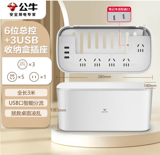 公牛(BULL)带USB新国标收纳盒延长线插座/6位全长3米 GN-F2151U (zhyghf_221711936)SKU:yzwhyp886416
