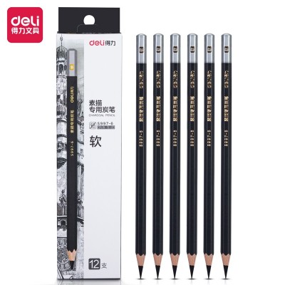 得力S997-6素描专用炭笔软碳(混)(12支/盒)