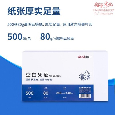 首页 > 纸及纸质品 > 纸及纸板(不包含复印纸) > 得力 优选80g空白单据凭证纸 适用于用友金蝶财务软件记账凭证打印纸 240*140mm 500张 22005 802100250(zhyghf_802100250)SKU:yzwhyp888623