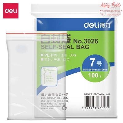 首页 > 用具 > 其他厨房用具 > 得力(deli)100只透明自封袋 190*140mm 票据保存袋 速封口PE防潮袋 3026 (zhyghf_71912495)SKU:yzwhyp889109